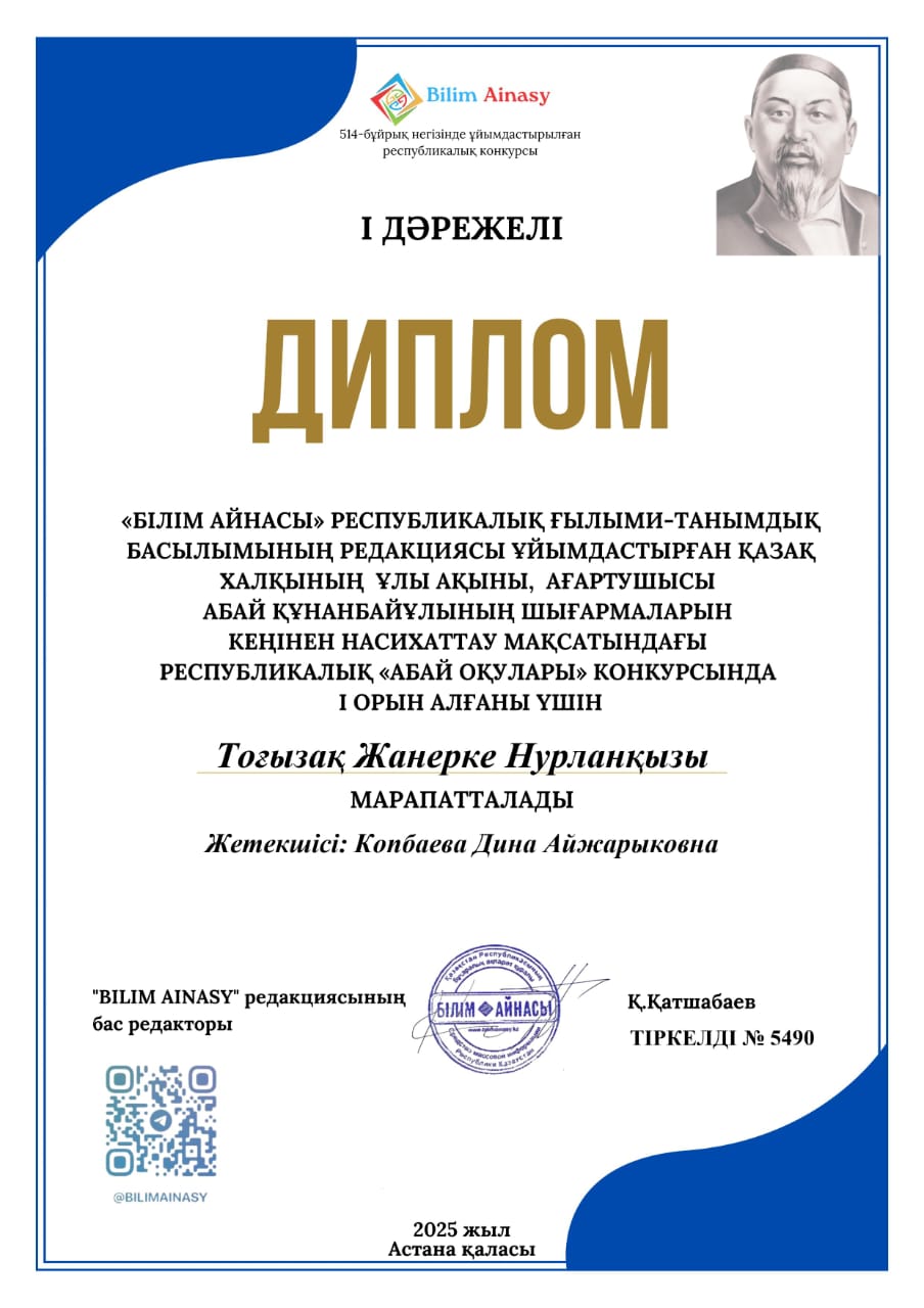 №23 Тескентоған ЖОББМ мектепалды сынып тәрбиелкнушілері:Тоғызақ Жанерке,Жайлау Арманжан,Мұхтархан Ерсұлтан Республикалық "Білім айнасы" ғылыми- танымдық басылымы ның үйымдастыруымен өткізілген "Абай оқулары"байқауына қатысып,1дәрежелі дипломдармен марапатталдыЖетекшісі :Копбаева Д.А.